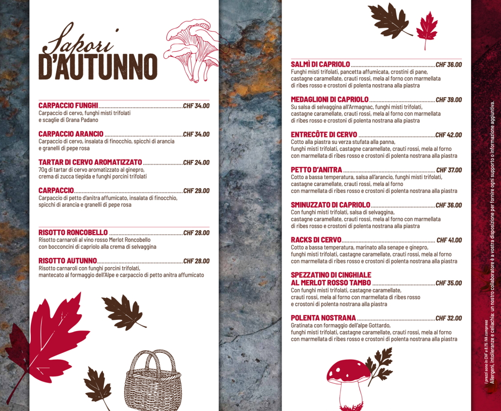 Dai medaglioni di capriolo al salmì, dallo spezzatino di cinghiale al Merlot ai racks di cervo marinati, ogni portata racconta la passione per la cucina stagionale e genuina. Antipasti come il carpaccio di cervo o la tartare aromatizzata al ginepro e risotti cremosi completano l’esperienza, regalando agli ospiti un’autentica immersione nei sapori d’autunno.